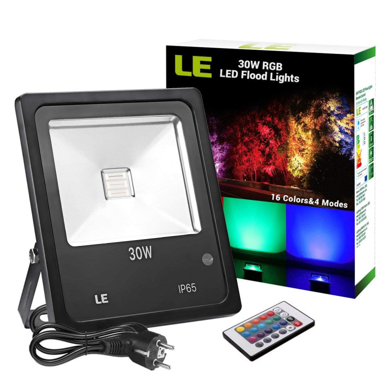 - RGB-Flutlicht: 30 Watt Fluter mit 16 Farben und 4 Lichtmodi, steuerbar durch Fernbedienung.